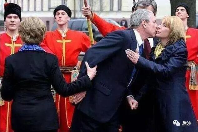 那张亲吻照,人们的焦点都放在了小布什身上,还有用手拉他的夫人,被吻的女人网友只知道她是乌克兰总统夫人。