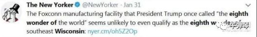 《纽约客》则讽刺:当初特朗普把富士康工厂形容成“世界第八大奇迹”,但如果有“威斯康星州东南部第八大奇迹”,估计这家工厂都排不上号。