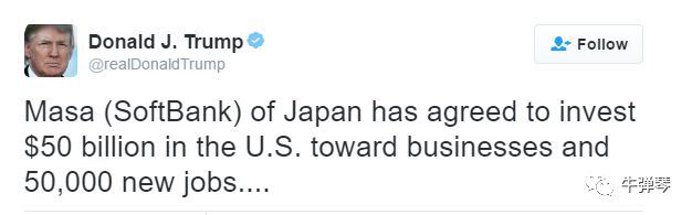 孙正义宣布:为了表达对特朗普的支持,在美国投资500亿美元,帮美国创造5万个就业岗位。