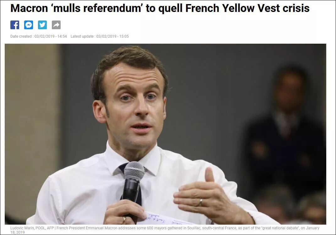 小马是什么办法都想了,“黄背心”们就是不罢手,法国政府无可奈何。法国France 24电视台2月3日援引法《星期日报》消息称,马克龙正考虑举行一场全民公投,以平息这场持续12周的“黄背心”危机。法媒称,这将是对“黄背心们”诉求更多“直接民主”的回应。根据报道,此次公投可能涉及的议题包括经济、社会、政治等。《星期日报》推测,议题还涵盖法国是否需要减少议员人数以及是否应该缩短议员任期,这曾是马克龙的一项竞选承诺。