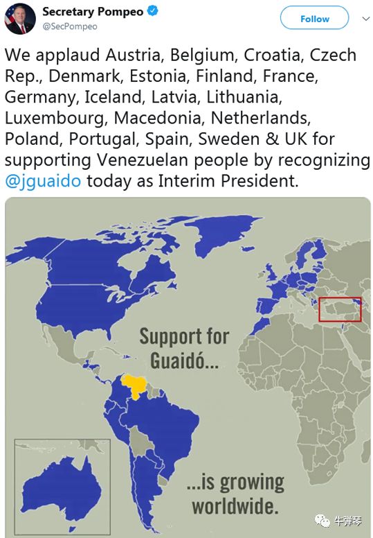 标蓝色的,都是支持瓜伊多的;灰色的,还支持委内瑞拉总统马杜罗的。