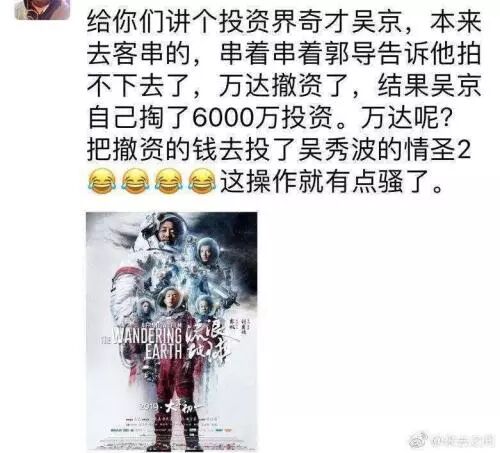 更有戏剧性的是,据媒体报道,吴京投的这6000万,是万达撤资的6000万。万达撤资这6000万,根据媒体报道是投资了吴秀波主演的《情圣2》。结果,这两天万达因此被黑惨了,万达这笔失败的投资成了社交媒体的嘲笑对象。
