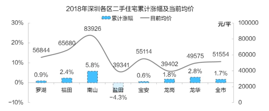 但深圳不是北京上海的中心化环形格局,南山、福田、龙华中心区域全年均价还涨了,南山累积涨幅最大,有5.8%,而且学位房非常抗跌,只有盐田均价跌了4.3%。