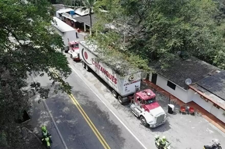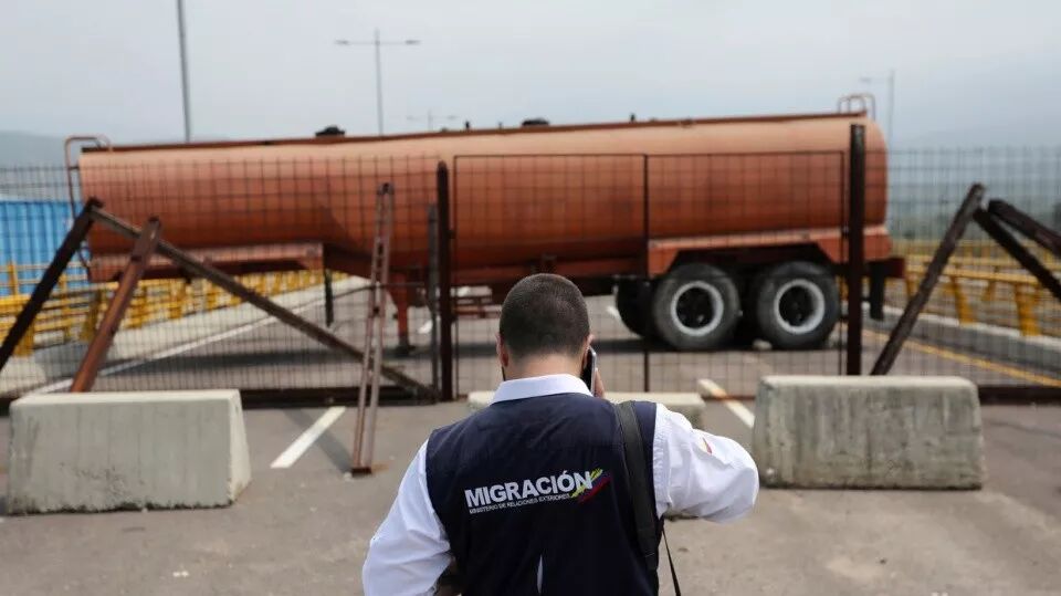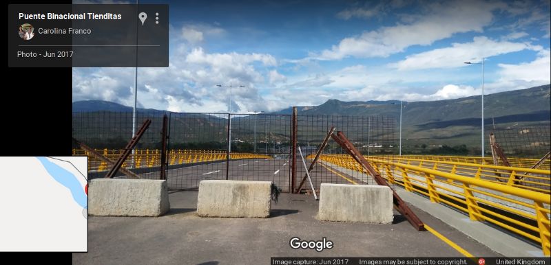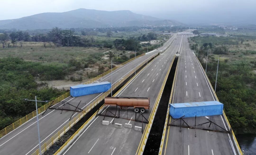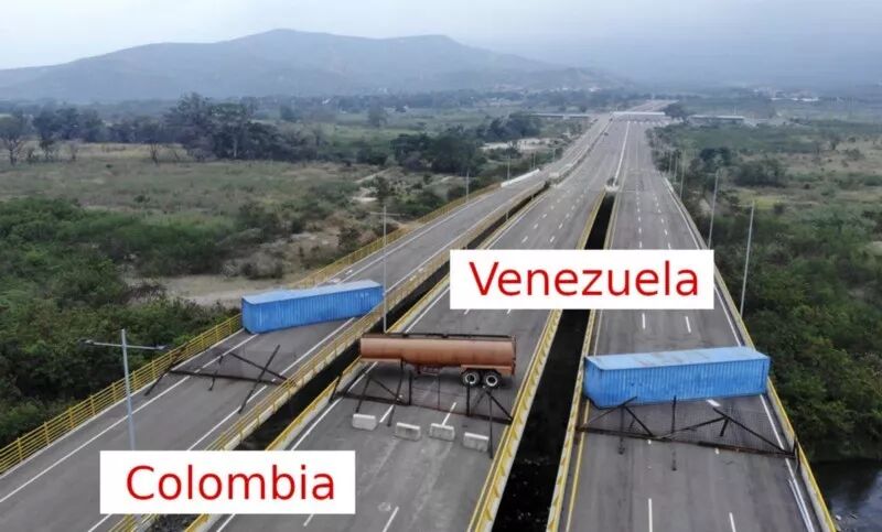 图中的大桥,是连接哥伦比亚库库塔与委内瑞拉乌瑞尼亚的提恩达斯国际大桥。集装箱、铁丝网、拒马和路障工事将大桥拦腰封锁,委内瑞拉一侧还有军人在严阵以待,气氛肉眼可见的紧张。