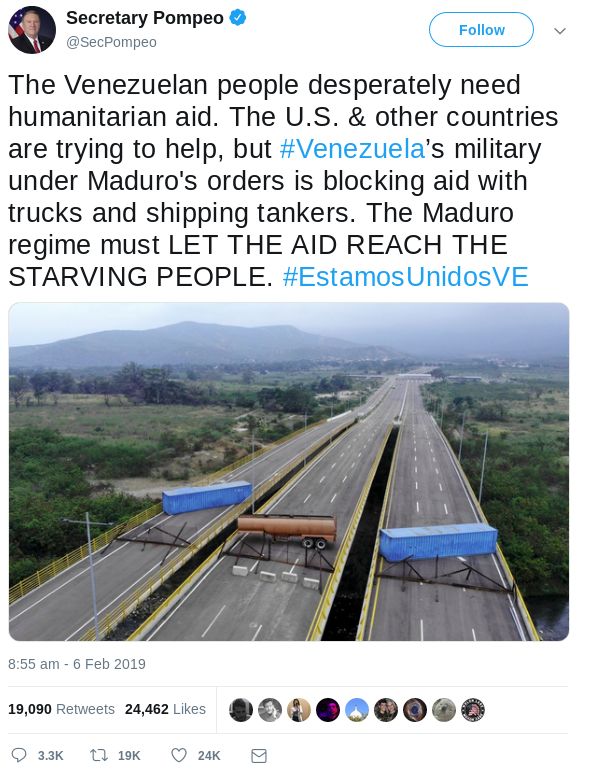 像早就知道马杜罗会说“不”一样,美国国务卿蓬佩奥发推,指责委内瑞拉军方故意在“马杜罗的命令”下阻止援助物资入境,要求委内瑞拉重新开放大桥,以便让救援物资进入委内瑞拉。