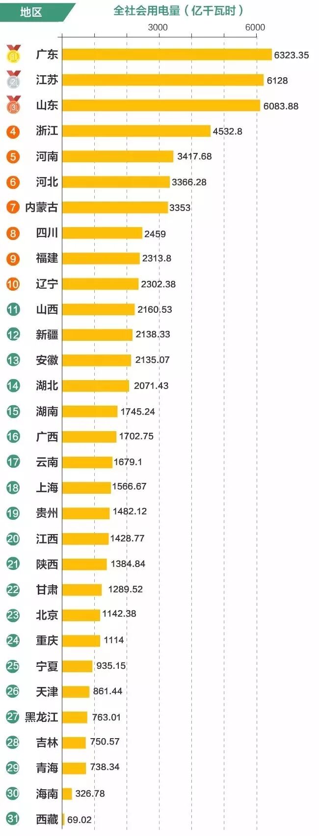 其中,广东、江苏、山东,勇夺中国耗电量排行榜前三位,单省各自耗电总量均突破6000亿千瓦.时大关。