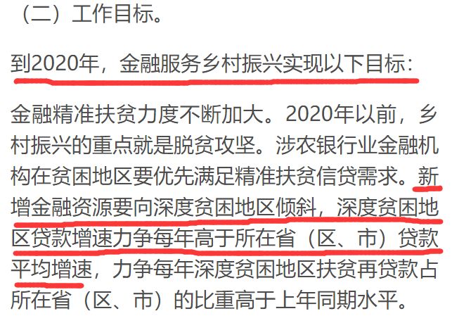 下面,我给大家解读下《指导意见》中和大家联系最密切的精华部分。《指导意见》明确指出,金融资源要向深度贫困地区倾斜,深度贫困地区的贷款增速要高于所在省(区、市)贷款平均增速,要在2020年实现这个金融服务乡村振兴的目标。