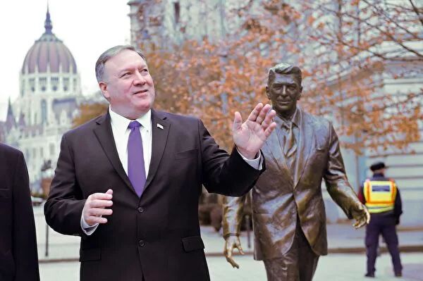 美国国务卿蓬佩奥11日抵达布达佩斯。虽然行程紧密,但他还是抽空去了趟布达佩斯自由广场。广场上的里根雕像依旧面带微笑,蓬佩奥在前总统像前留影,也是满脸愉快。