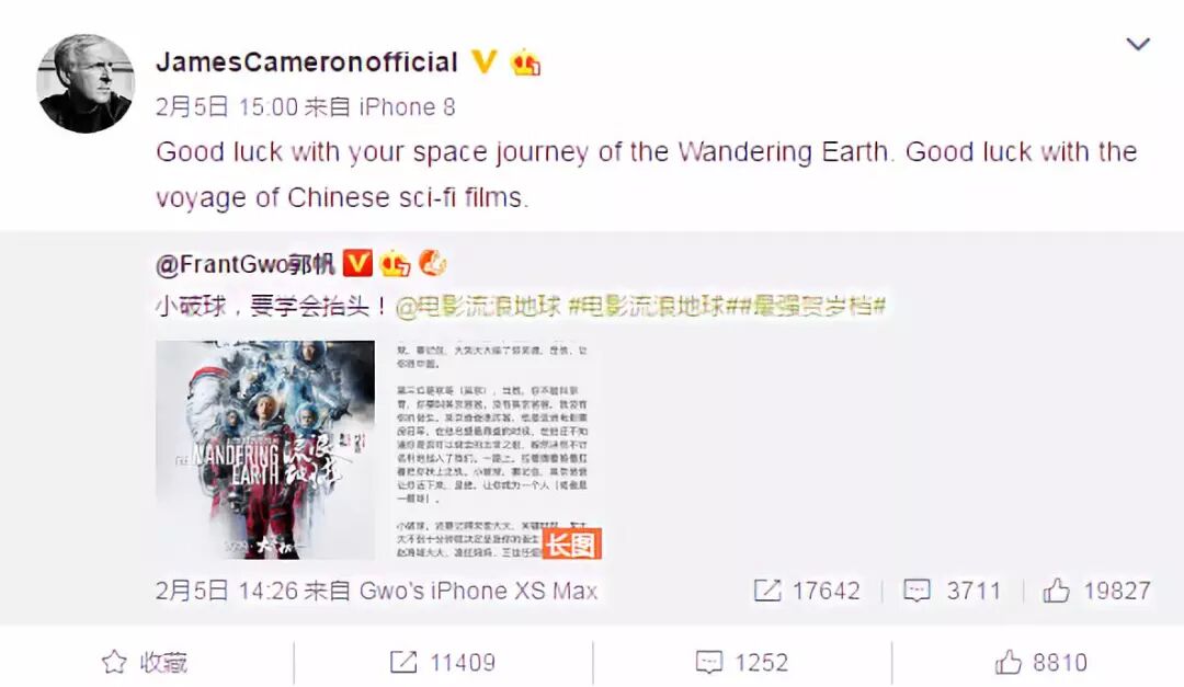 贺岁档众星云集,“小破球”票房登顶,质量可见一斑。在微博上,知名大咖卡梅隆,也为它转发点赞。