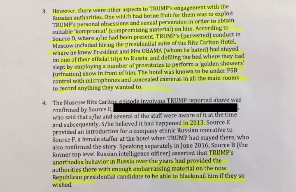 特朗普雇用了一群特殊女性到房间,在他面前表演Golden Showers(中文名字叫做“黄金浴”,具体什么,自己问度娘)。