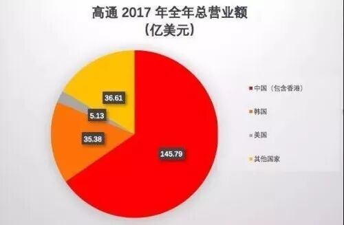 你看高通怎么办?高通2017年的营业额(下图),红色部分是中国,橙色部分是韩国,美国看这个缝儿,就一条细缝儿,跟人的眼睛眯了条缝一样,高通在美国没有什么销售。