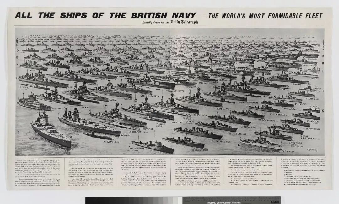 ▲1938年英国《每日电讯报》刊发的英国皇家海军全景图,这张图足以说明当时英国皇家海军的盛况,文字说明还格外强调这只是服役的舰艇,而不包括1939年计划建造的舰艇。