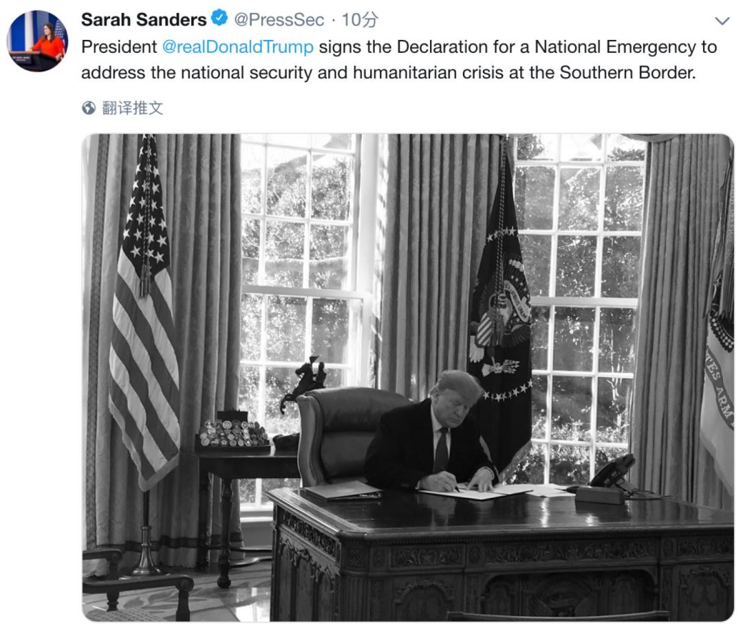特朗普表示,他将签署命令宣布国家进入紧急状态。他说,这项命令之前已经签署过多次,1977年以来其他总统也签署过,既然赋予了总统这项权力,他干这事就没有任何问题。很快,白宫新闻秘书桑德斯就在推特上发布了特朗普签署命令的照片,真的是不给民主党一点反应的时间。