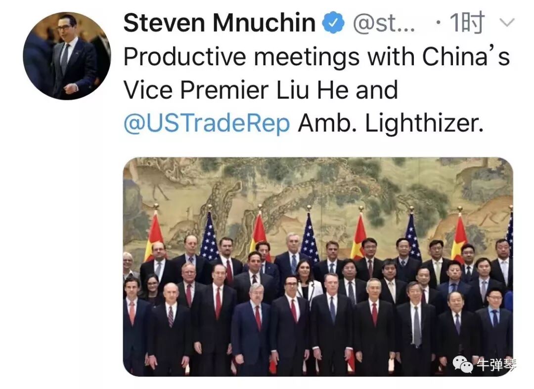 很有意思的,这次磋商一结束,美国财长姆努钦立刻发了一条推特,上面写道:和刘鹤副总理、莱特希泽大使进行了富有建设性的会议。