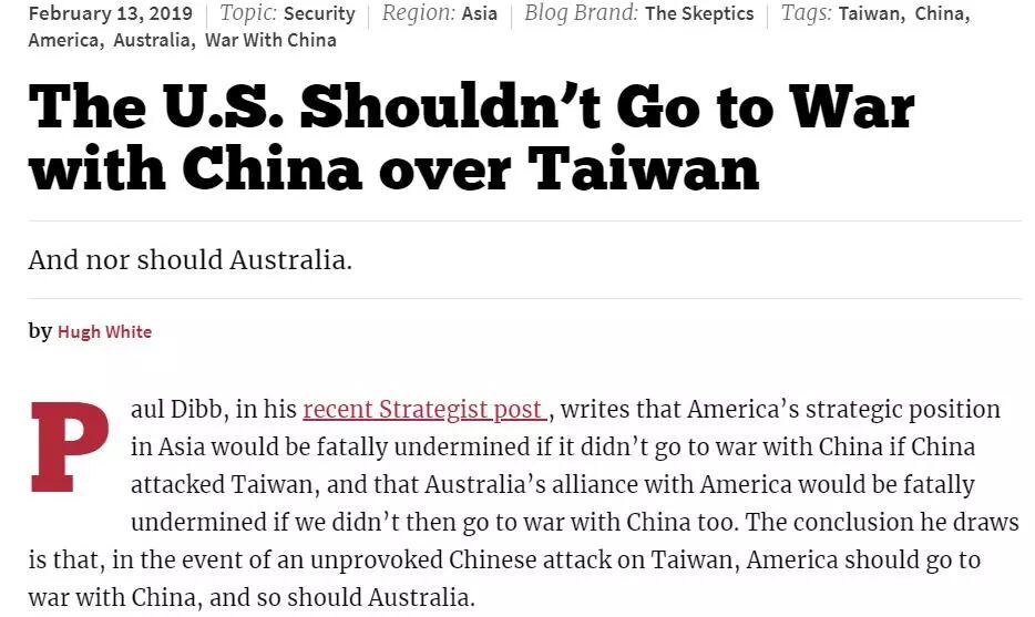 怀特总结称,万一美国选择了战争,澳大利亚明智做法是避远些,伊拉克的经历明确显示,在一场打不赢的战争中支持盟友没有意义,而且这场战争赌注要高得多。何况美澳同盟条约是否涵盖中国台湾,并没有明确规定,条约第4条关于“太平洋地区”的表述模糊,长期以来澳大利亚主动避开了台海纷争。因此,澳大利亚不应卷入台海战争,美国也不应该在台海问题上与中国开战。