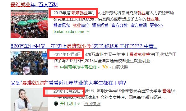 好像自从媒体信息大爆发以来,“最难就业季”似乎就没有消失过。也不知道是媒体们总想搞个大新闻,还是别有用心的“小玩笑”。打开某度,果然,历史真是有趣。