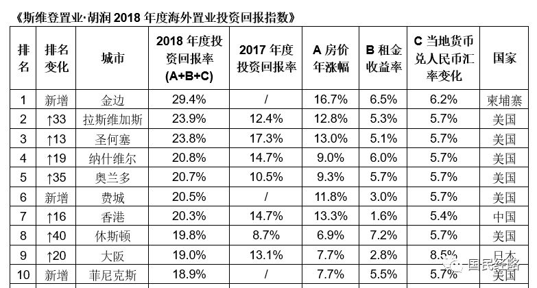 根据胡润报告,2018年,金边跃居全球房价涨幅第一位,涨幅达16.7%。如果加上租金回报率以及汇率变化收益,金边的投资回报率高达29.4%,超过美国的拉斯维加斯和圣何塞,成为海外置业投资回报最高的城市。