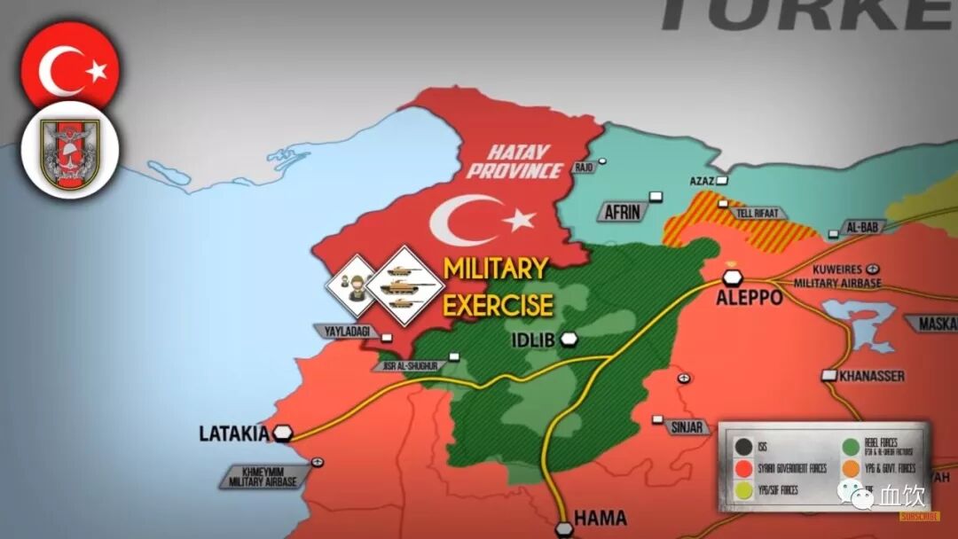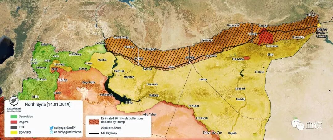 上图一标注的是横贯土耳其东西两端的邪恶走廊,下图黄色斜线区域为土耳其主张的安全区。