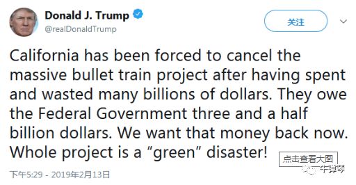 加州在浪费了那么几十亿美元后,被迫决定取消子弹列车(高铁)项目。他们欠联邦政府35亿美元。我们要求他们还钱。整个项目就是一个“绿色”灾难。