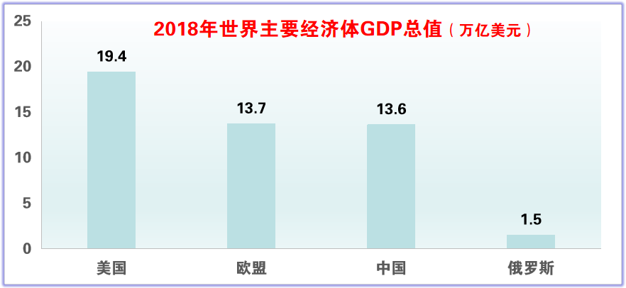 欧盟经济实力是三强之一,虽然它不是一个国家,但是它是一个完整的经济组织,具有较强的合力,2018年欧盟的GDP为13.7万亿美元,世界排名第二;第一为美国,19.4万亿美元;中国第三,为13.6万亿美元,而俄罗斯则仅为1.5万亿美元,仅为中国的十分之一多点。