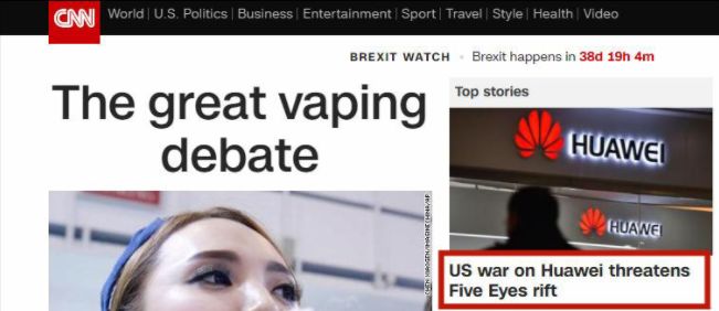 针对此事,CNN19日头条评论道:美国对华为的战争可能造成‘五眼联盟’裂痕!