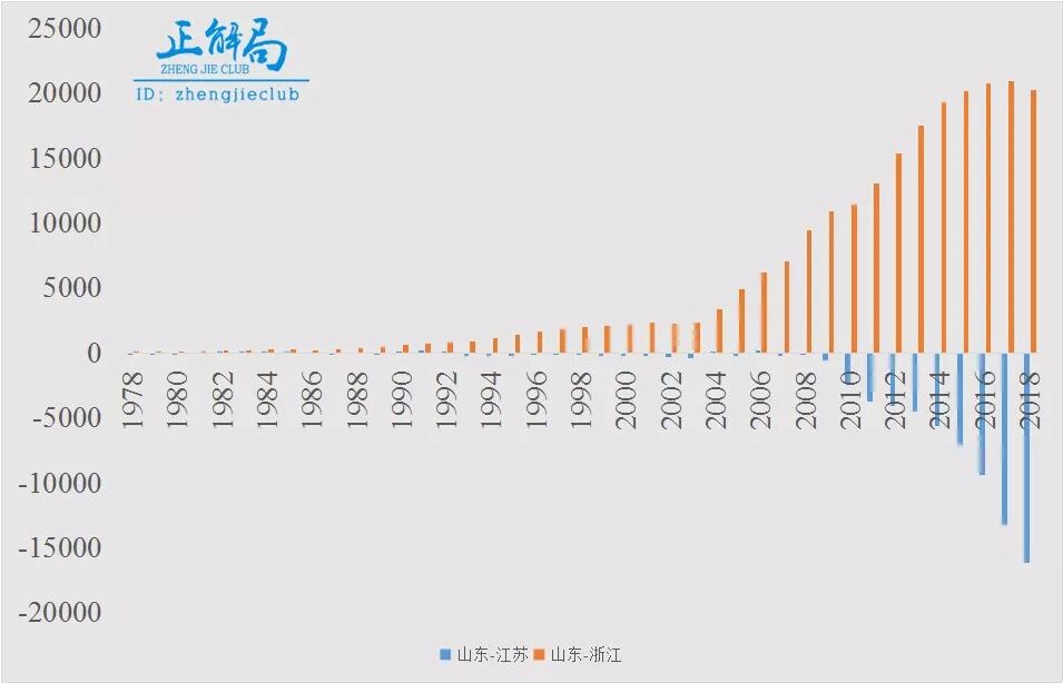 山东和江苏、浙江GDP之差(单位:亿元)