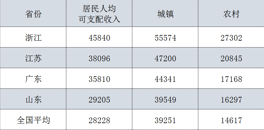 2018年,山东居民人均可支配收入29205元,其中,城镇居民3.9万,比全国平均高7%;农村不到1.5万,比全国平均水平高出11%。