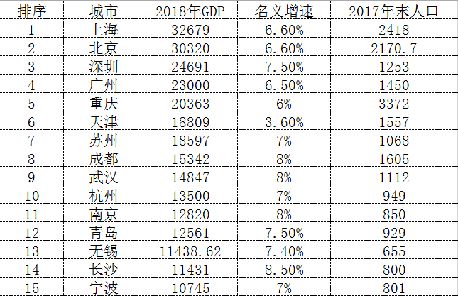 部分城市2018GDP排名(初步统计数据)