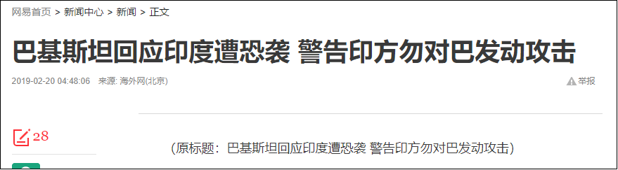 事情的起因是:2月14日,印控克什米尔地区发生一起自杀式袭击,造成40多名印度中央后备警察部队士兵死亡,另有数十人受伤。袭击发生后,印度外交部指责这起袭击与巴基斯坦有关,而巴基斯坦则否认与其有关。