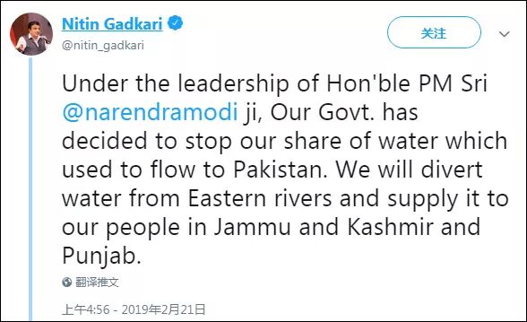 加德卡里发布的推特:莫迪总理领导下的我国政府决定限制向巴基斯坦供水。
