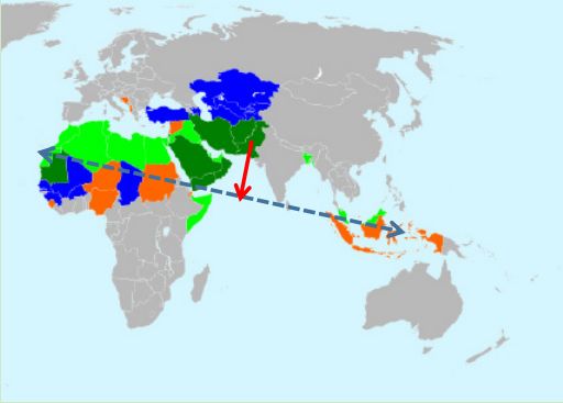 其实原因很简单,人一有了钱,就总想做点什么,当初沙特依靠石油暴富之后,那些王公大臣们就一直希望扩大逊尼派的阵营,而巴基斯坦在地缘上正好是中东、中亚、南亚和东南亚四个地区的交汇点,如果我们翻看地图的话,就可以清晰的发现,整个伊斯兰世界西起北非的摩洛哥,东至亚洲的印度尼西亚,而巴基斯坦正好位于它的中心点,这可是沙特向东南亚传播信仰的好机会啊!于是沙特就毫不犹豫的开始不断援助巴基斯坦。