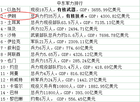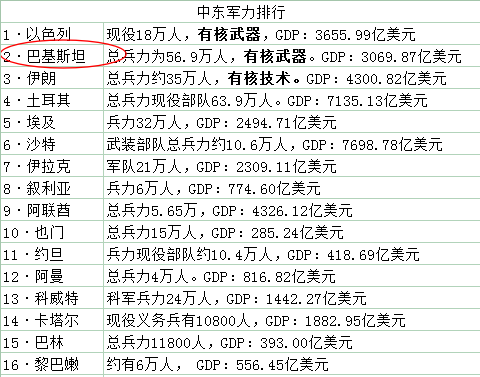既然如此,我们就看看,单纯就军力纸面数字而言,如果把巴基斯坦放在中东,它能取得一个怎样的排名: