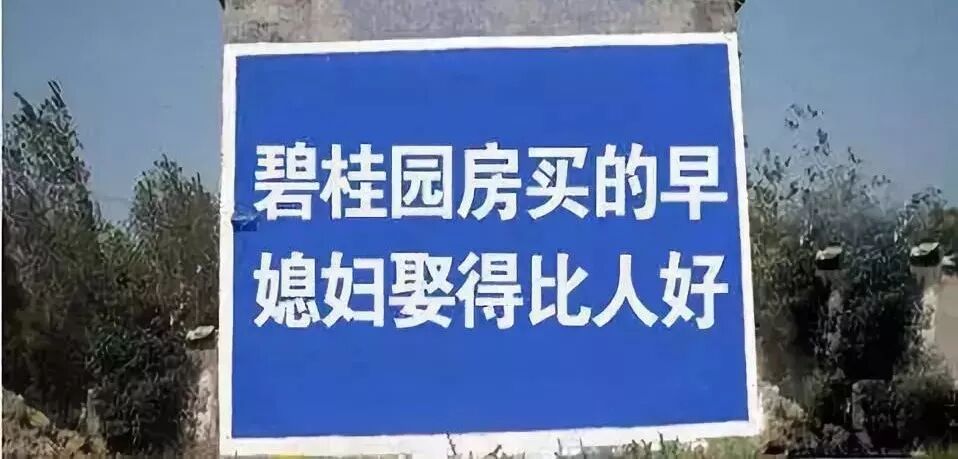 如今,哪怕是在犄角旮旯的村庄,你能看到深入灵魂的、浓浓乡土气息的“碧式”墙体广告语,比如“碧桂园房买的早,媳妇娶得比人好”、“碧桂园房不可少,媳妇不会跟人跑”,都深刻暴击了三四线老百姓的痛点。