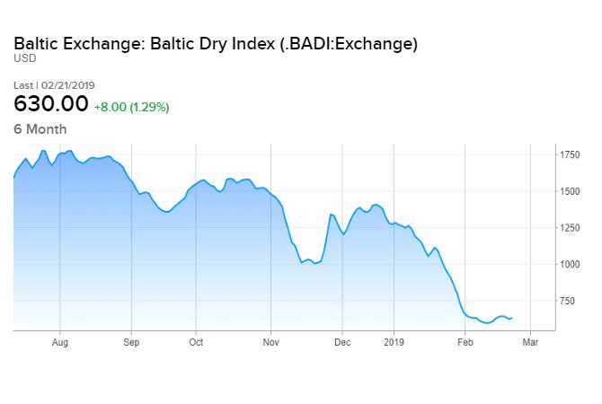 如今,全球航运价格罕见遭遇了12年以来最为严重的暴跌。2019年不到两个月的时间里,BDI波罗的海指数断崖式腰斩了50%,距离18年年中的高点更是跌去了66%,来到了接近纪录低点的水平。