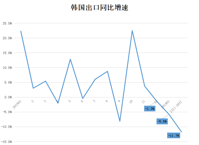 韩国2月份前20天对华出口下降14%,连续4个月萎缩;