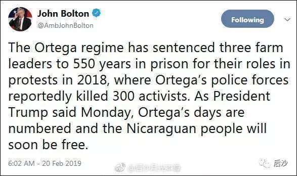 博尔顿在2月20日说 :“奥尔特加政权判处3名农民领袖550年监禁,罪名是他们参与2018年的抗议活动。据报道,奥尔特加的警察部队在那次抗议活动中杀死了300名活动人士。正如特朗普总统周一所说,奥尔特加的日子不多了,尼加拉瓜民众很快将会获得自由。”