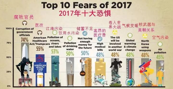 现在对腐败的担心上升到第一位,有74%的人担心,公知们一定会说,这是拿错剧本了;第三就是江河污染,所以美国的大鲤鱼吃不得;还有很多担心,自己看图吧。