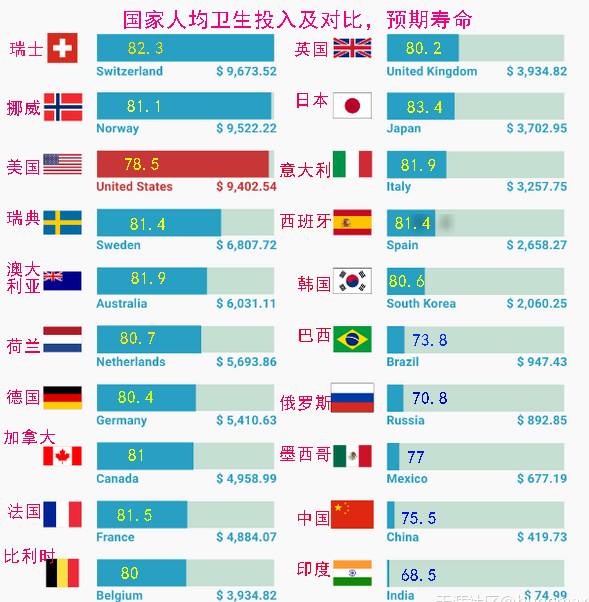 当然,美国还有一些挣钱的行业,不过那主要是挣国内的钱。比如医药行业。美国是很厉害的,不过除了药品和器械出口,还是挣国内的钱。只是资本有些吃相难看,花了几乎最多的钱(人均9400美元),可是效果还不如古巴(79.1),略高于中国。色条中的数据就是预期寿命。