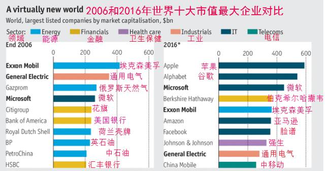2006年,在市值最大的十家企业中,只有微软属于IT企业,能源企业占了五席,金融企业占了三席,并且有五家是非美国企业;但是在金融危机后的2016年,IT企业异军突起,占据五席,金融、能源、医药、制造业、电信各分得一席,关键是,非美国企业只剩一席。