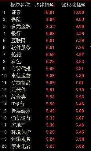 最壮观的是——券商板块42只股票全部涨停,保险板块接近整体涨停,银行板块涨幅超过8%。而两市成交量,也在近三年来首次突破了1万亿。