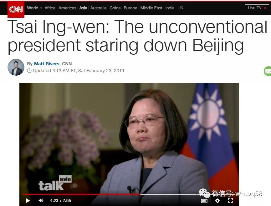 近日,美国有线电视新闻网(CNN)对蔡英文做了一次采访,采访中,蔡英文不仅全程称大陆为“中国”,并且特别强调了所谓的“中国威胁”,称“面对中国威胁的不只是台湾,而是全世界”,中国第一个会对台湾动武,之后呢?“我们希望周边以及相同的国家,一起来支援台湾”、“必须增加中国对台使用武力的政治成本”等等挑唆、挑衅性的言论。