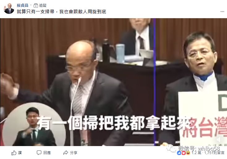 24日,民进党当局“行政院长”苏贞昌更是在“立委”质询时称:“若中国对台动武,就算是只有一支扫帚我也会上前线。”并将这段视频发在其脸书上。