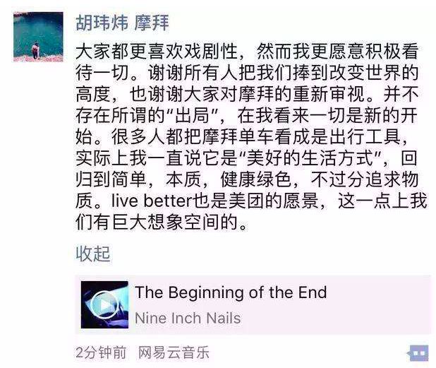 在2018年初,胡玮炜就主动放弃了无底洞般的烧钱战,同意将摩拜作价27亿美金卖身美团。在摩拜被美团收购的第二天,胡玮炜朋友圈里这样说道:“大家都更喜欢戏剧性,然而我更愿意积极看待一切。”