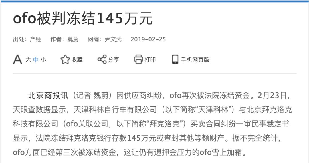 新年伊始,曾经被堵门讨债的ofo小黄车又上了热搜,ofo关联公司北京拜克洛克科技有限公司账户里145万余额被申请冻结,这已经是近两个月来,小黄车遭遇的第三次资金冻结了。