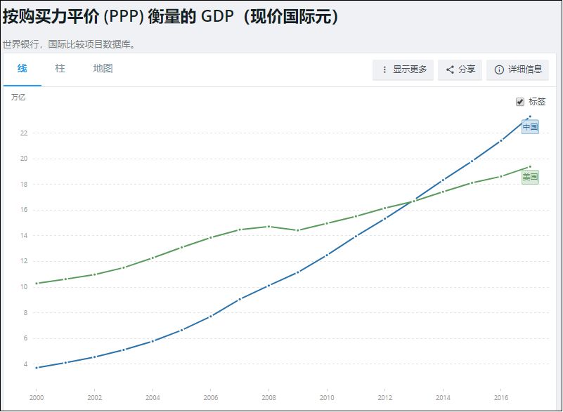 我们来看看中美实际的经济实力:中国在2013年的时候购买力平价已经超过美国,在2017年的时候中国的购买力平价为23.3万亿国际元,而美国仅为19.4万亿国际元,中国的购买力平价GDP是美国的1.2倍。