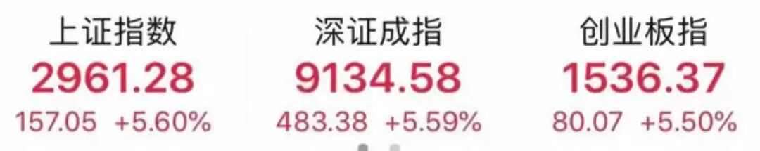 截至收盘,上证大涨5.6%,成交4,660 亿,深证大涨5.59%,成交5,746亿,创业板涨幅超5%,成交1571亿。