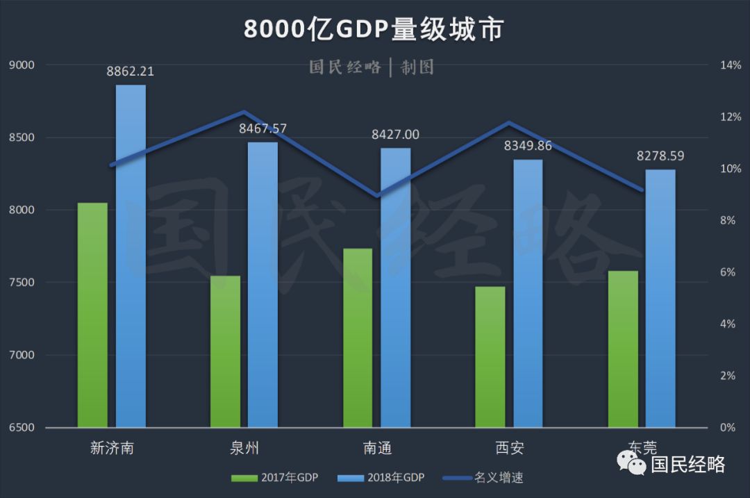在佛山之后,进入8000亿量级的城市有五个:西安、泉州、南通、东莞,以及合并莱芜之后的新济南。