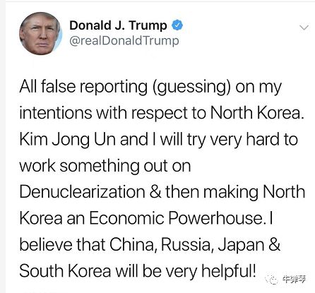 在我对这个国家的尊敬和意图方面,都是假新闻(乱猜)。我和他将十分努力,在无核化问题上取得些什么,然后使这个国家成为一个经济强国,我相信中国、俄罗斯、日本和韩国会帮上大忙的!