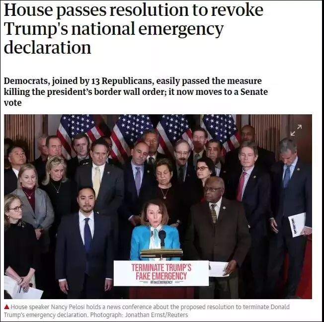 美国众议院于26日以245票比182票通过了一项决议,推翻特朗普此前为建边境墙而宣布进入“国家紧急状态”的声明。