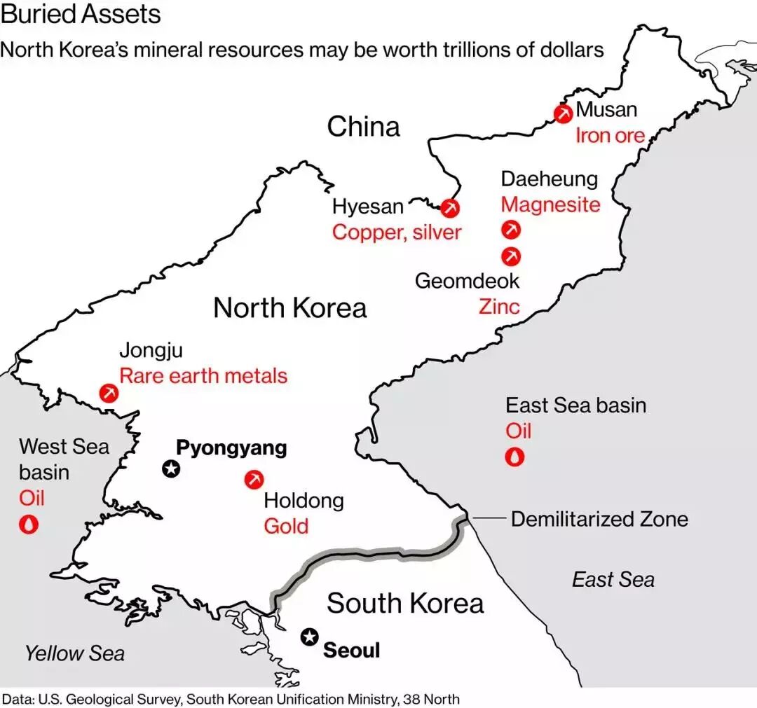 2、朝鲜还有很多丰富的矿产资源,尤其是稀土和铁矿。据朝鲜资源研究所估计,这些矿产资源价值可能高达6万亿美元。朝鲜东西海域有丰富的石油和天然气资源。